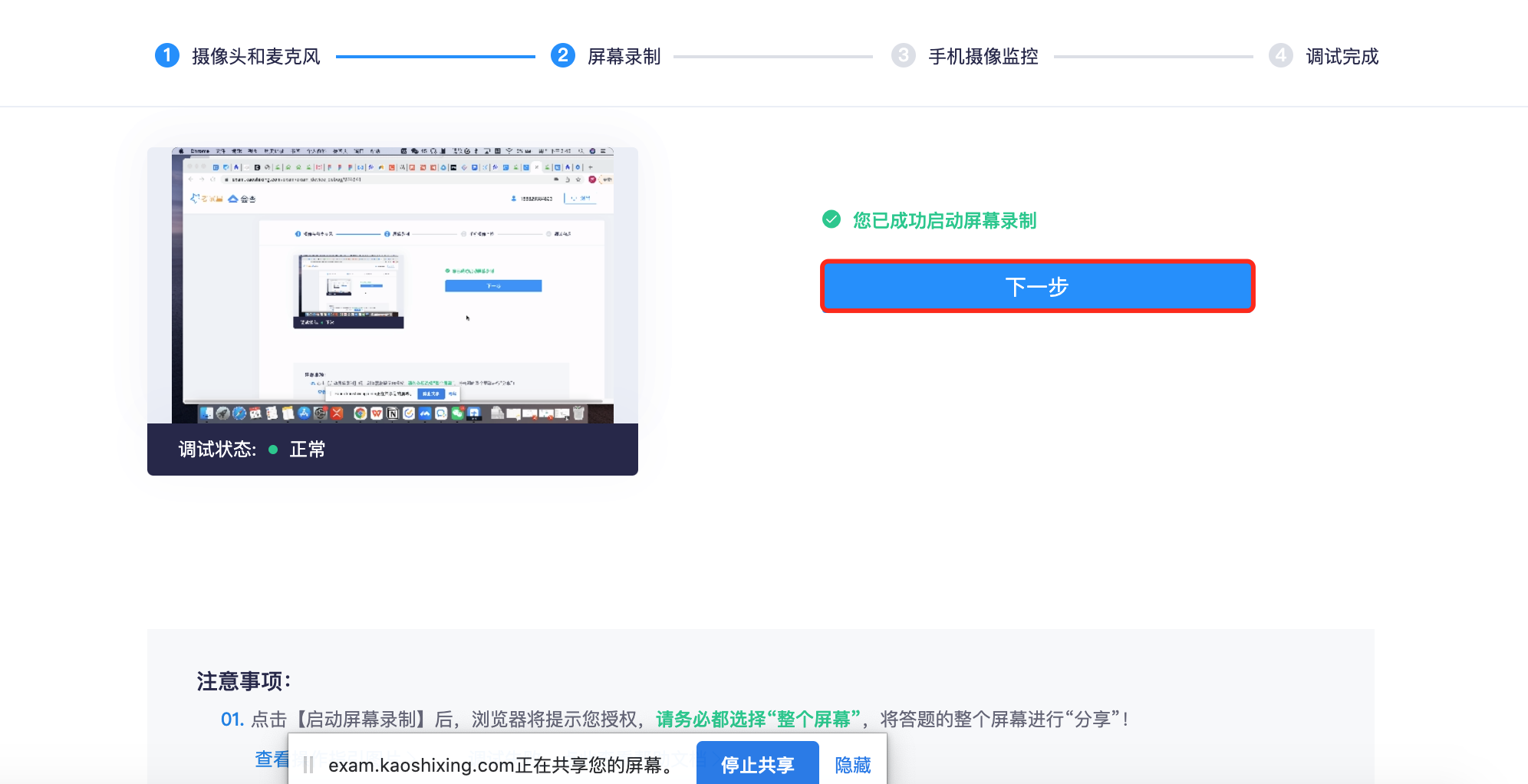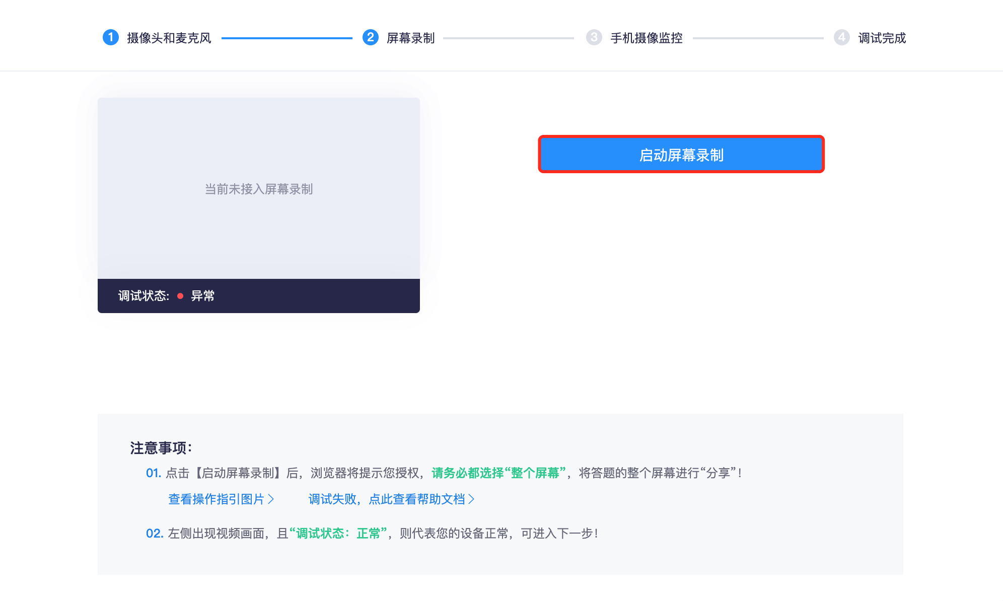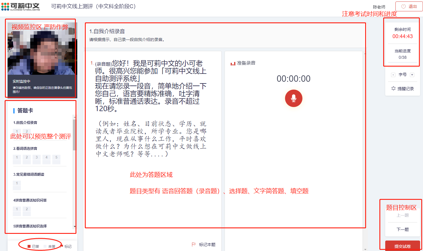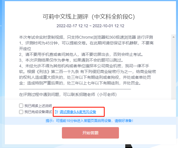 ## 一、我们的招聘流程 | | **招聘环节** | **持续时间** | **详细说明** | | ------- | ------------------ | ---------------- | ------------------------------------------------------------------ | | 1 | 填写报名表 | 5-10 分钟 | 填写老师信息表,让我们更好的了解您的情况。 | | 2 | 线上 AI 评测 | 30-45 分钟 | 自助评测,半人工判分。根据得分情况决定是否进入下一轮。 | | 3 | 微课录制 | 10 分钟 | 主要考察老师上课风格及普通话水平。 | | 4 | 1 对 1 面试 | 15-20 分钟 | 主要考察老师设备、网络、以及一些综合情况的介绍。 | | 5 | 自助培训 | 1-2 天 | 参加我们的培训,学习授课软件使用,了解课程课件,中文知识学习 | | 6 | 成果验收 | 1-7 天 | 1 对 1 磨课指导、安排考核课程。 | | 7 | 正式合作 | 6 个月起 | 考核合格,签署电子的实习/兼职协议。开通教师账号,正式合作 | 成果验收主要包括:安排考核课程一次、考核课之前会有专业的老师 1 对 1 指导。 **正式合作的老师签署协议,要求最少合作时间为一个学期(6 个月)** ## 二、参加线上 AI 自助评测的准备 ### 2.1 浏览器和硬件设备要求 线上评测系统目前仅支持「**Chrome 浏览器**」和「**360 极速浏览器**」,其他浏览器无法正常参加线上测评  **请下载以上两款浏览器任一款即可,如果您的电脑已经安装了 360 极速浏览器或者 chrome 浏览器,可以直接登入评测系统。如果您是 Mac 系统电脑,请下载 Chrome 浏览器进行在线评测。** 千万别下载到假冒的浏览器,请不要 baidu 去搜! **我们目前推荐使用 2018 年之后生产的笔记本电脑上课。要保证电脑操作流畅,有摄像头和麦克风。** 360 极速浏览器下载地址:[https://browser.360.cn/ee/](https://browser.360.cn/ee/) Chrome 浏览器下载地址:[https://www.google.cn/chrome/index.html](https://www.google.cn/chrome/index.html) ### 2.2 登入评测系统 我们招聘老师会通过微信和 Email,发送给您线上评测系统的网址及账号密码(一般账号是您的手机号,密码是 a+ 您的手机号码) ### 2.3 提前调试设备 首先确认您电脑的摄像头、麦克风、声音播放都正常。 **如果没有试过麦克风是否正常,可以先用微信电脑版发一段语音消息看是否正常!!!** **如果没有试过麦克风是否正常,可以先用微信电脑版发一段语音消息看是否正常!!!** **如果没有试过麦克风是否正常,可以先用微信电脑版发一段语音消息看是否正常!!!** 有很多老师还不知道自己麦克风是否正常的情况下,就开始自助评测。导致成绩无效很可惜。 登入到评测系统后,不要马上开始答题。请点击「调试摄像头&麦克风设备」  #### 第一步:启用摄像头和麦克风  **Chrome 谷歌浏览器,摄像头和麦克风授权示例:**  **注:苹果电脑用户,需在系统偏好设置—安全性与隐私页面,授权用作答题的浏览器允许调用摄像头和麦克风**  **如果您有多个麦克风,请一定选择可以正常使用的麦克风,大多数电脑只有默认一个。**  **调试成功后,点击页面出现的"下一步"按钮,即可进入流程第二步**  #### 第二步:屏幕录制(有些电脑没有此过程) **进入屏幕录制页面,点击"启动屏幕录制"按钮**  Chrome 谷歌浏览器,屏幕共享授权示例  注:苹果电脑用户,需在系统偏好设置—安全性与隐私页面,授权用作答题的浏览器允许调用屏幕录制功能  **调用成功后,点击页面出现的"下一步"按钮,即可进入流程第三步**  #### 第三步:调试完成 **进入调试完成页面,点击"返回答题入口"按钮,即可回到考试说明页面**  ## 三、线上评测的注意事项 1. 支持 24 小时自助评测,任何时间都可以。但是评测机会只有一次!如果因为设备原因耽误了一次(例如第一道录音题无法完成,停留时间不超过 10 分钟),可以跟招聘老师申请补考一次。 2. 简答题请一定要点击 **保存**,在进行下一道题。录音题提交完也要听一下是否清晰。 3. 请诚实评测,不要用手机查或者问其他人,请不要切屏出去,否则会终止考试。 4. 本次评测结果仅作为参考,如果遇到不会的题可以跳过或者留空。 5. 线下自助评测系统 **仅支持电脑登录访问** ,不支持移动端设备及平板。 6. 在评测过程中遇到问题,在上班时间可以联系招聘老师(小可老师)或者拨打 0771-7711586 **注意:进入到考试界面会自动全屏,请不要切出屏幕。左上角视频监控区域会实时录制。**  **如果中途退出屏幕,超过 5 秒就会结束考试。**  **本次评测采用自动 + 人工组合判分形式。一般提交后 1-2 个工作日会得出结果。如果老师成绩不错,可以进入下一轮人工面试 + 自助培训环节。我们会以电子邮件 + 微信通知的形式通知。**